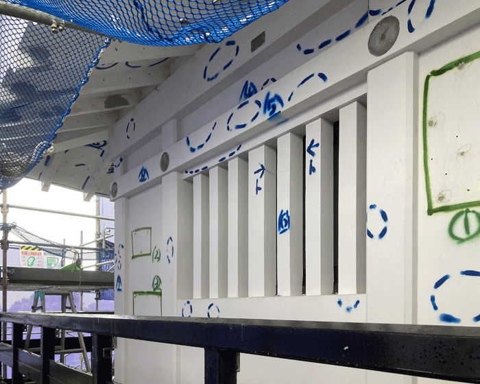 この石垣に足場をかけずに天守全体を足場で覆わなければならず、足場の設営に関しては設計段階から入念に検討を行った。