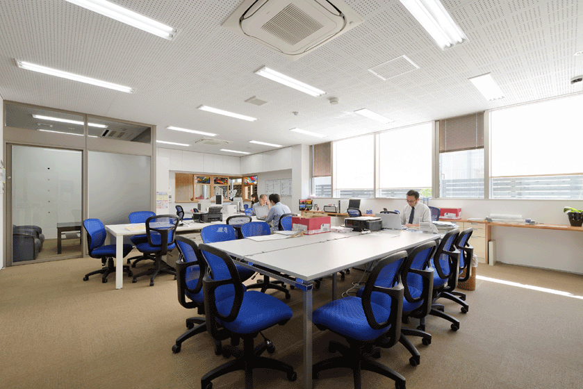 共用部分の仕上げには木材を多用し、内装制限に対応するため準不燃処理された杉板を使用している。作業以外の様々な行事やイベントにも対応できるように、